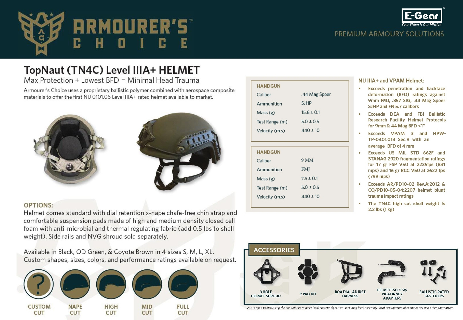 Exceeds DEA and FBI Ballistic Research Facility Helmet Protocols for 9mm & 44 Mag BFD <1"